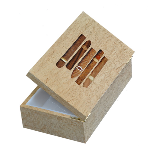 humidor with custom cigar inlay (click to enlarge)The marquetry technique lets you use many different species and colors of wood to create a picture. Contrasting wood tones can be juxtaposed for striking effects. And when top-coated with a clear finish, the grain has a 3D effect which shimmers and changes based on what angle you look at it. Each piece of veneer that I use is intentionally chosen for your project among thousands of varieties.